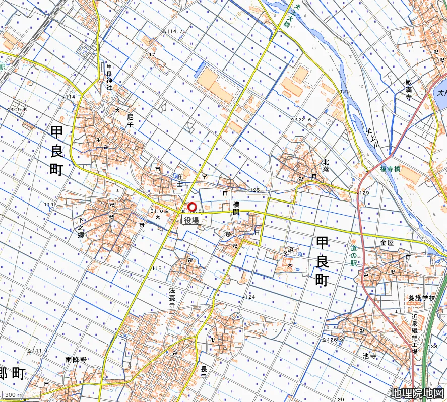 インターネット上の地図サイトで甲良町を見ると、 在士という地区は町の中心的な位置にあると言える。実際に町役場は在士地区にある。