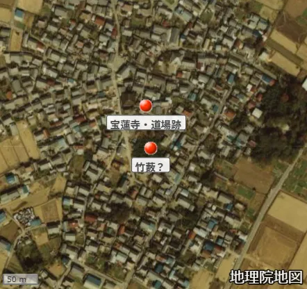 この中で地元下之郷では六社権現 (六所大明神) や桂城神社のある字 「宮前」 の東隣に 「北寺側」 や 「南寺側」 という明確に寺を示唆する字があることから、 この地を宝蓮院跡地と比定し現在は石碑が建てられている。12