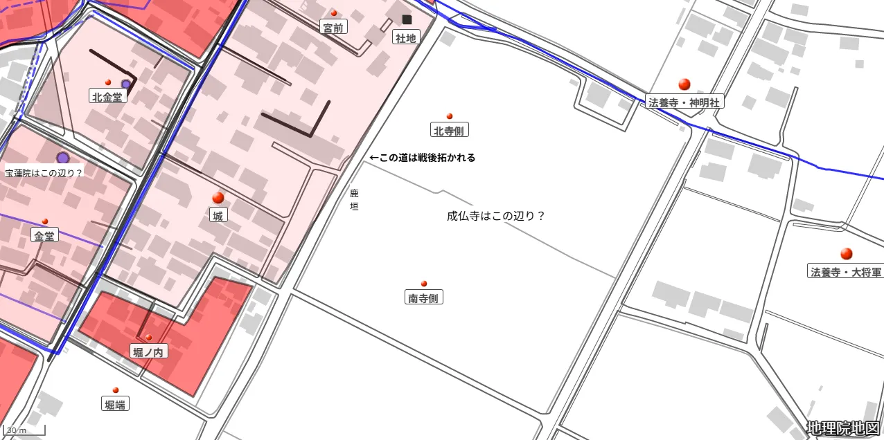 それでも朧気ながら二階堂宝蓮院を中核とした町の景色が浮かび上がり、 多賀氏累代や高虎の母がこうした環境で生まれ育ったことを知ることができる。
