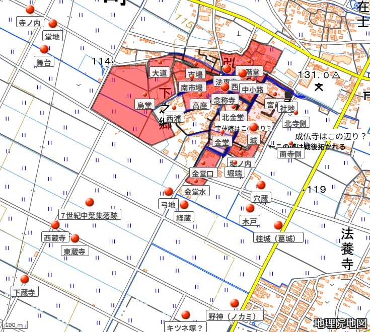 これは下之郷の地に 「二階堂」 以外の古代寺院が存在することを示唆するようにも見えるが、 現状で 「二階堂」 以外の古代寺院は推測でしか無く、 尚且つ字 ・ 二階堂の至近であることを踏まえると、 この 「金堂」 は二階堂内の主要施設で指すと考えるのが自然である。