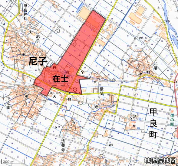 まず甲良は今も昔も村がポツポツと在るのだが、 在士村は西隣の尼子村に隣接している。特筆すべきは、 境目で接しているのが佐々木尼子の本拠地と伝わる 「尼子館」 である点で、 あたかも尼子館の城下町のように位置している。この点から考えると在士村は元々尼子村の一つであったのが独立したのかもしれない。