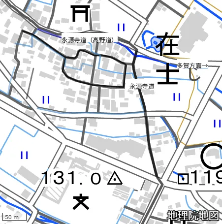 高野道は在士の中心部から程なく南へ折れ、 下之郷と法養寺の間を通る形になる。この道を挟み何度か村同士の相論も発生している。6