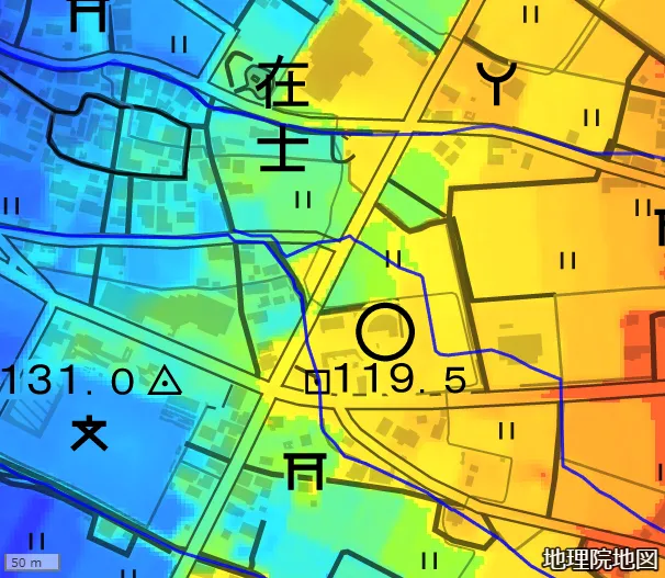 ところで地理院地図で 「陰影起伏図」 を選択し、 在士集落の様子を見ると耕作地の西側に南北に延びる起伏陰影が認められる。これも 「塹壕」 の名残かもしれないが、 詳細なところは定かではない。
