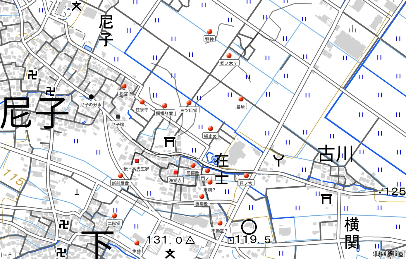 上図にも見えるが尼子 ・ 在士の中心部で 「高野道」 に沿って流れる水路がある。この水路を地域では 「尼子川」 と呼ぶ。8